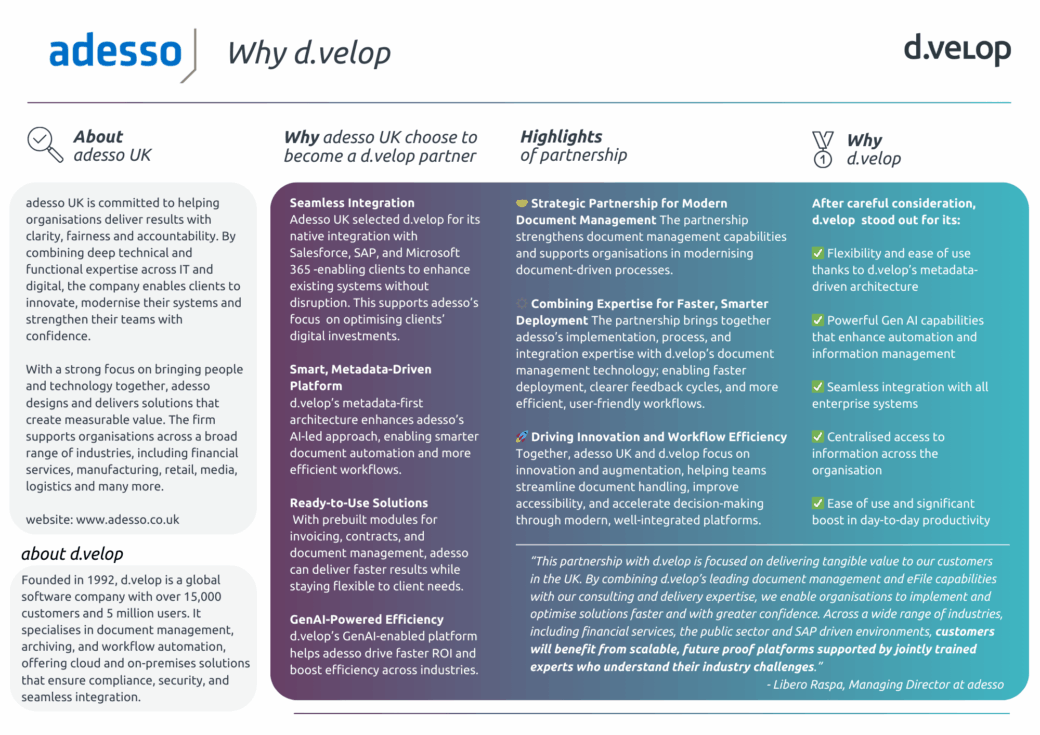 - Driving Innovation and Workflow Efficiency: Together, adesso UK and d.velop focus on innovation and augmentation, helping teams streamline document handling, improve accessibility, and accelerate decision-making through modern, well-integrated platforms.