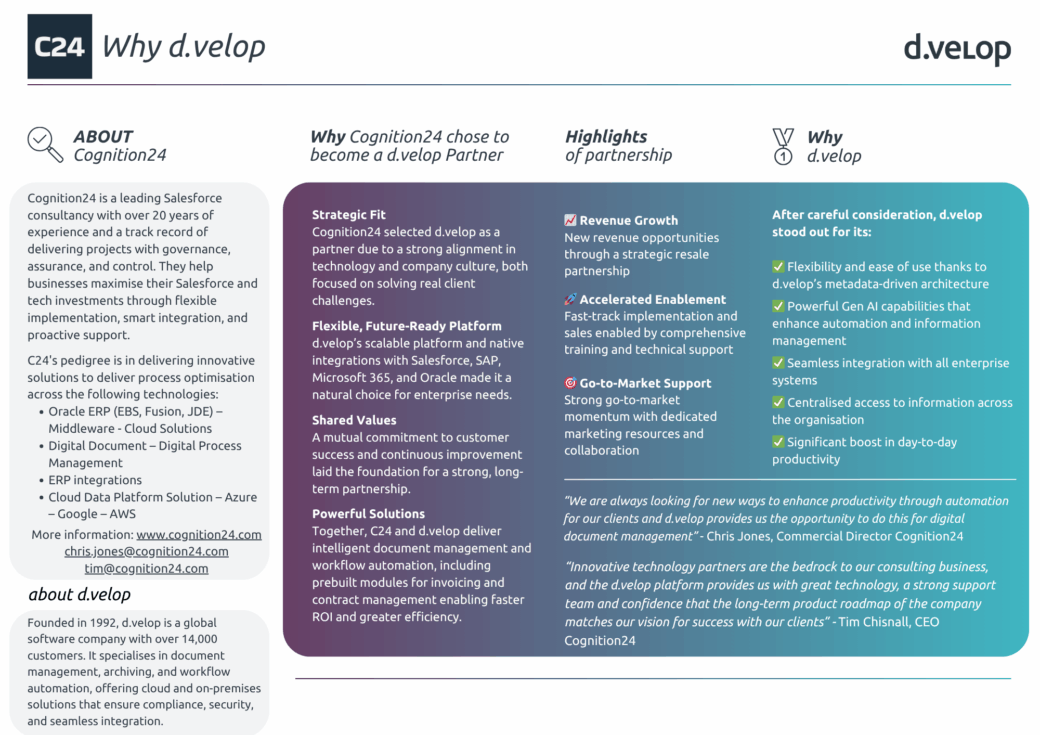 - Strategic Fit: C24 selected d.velop as a partner due to a strong alignment in technology and company culture, both focused on solving real client challenges.