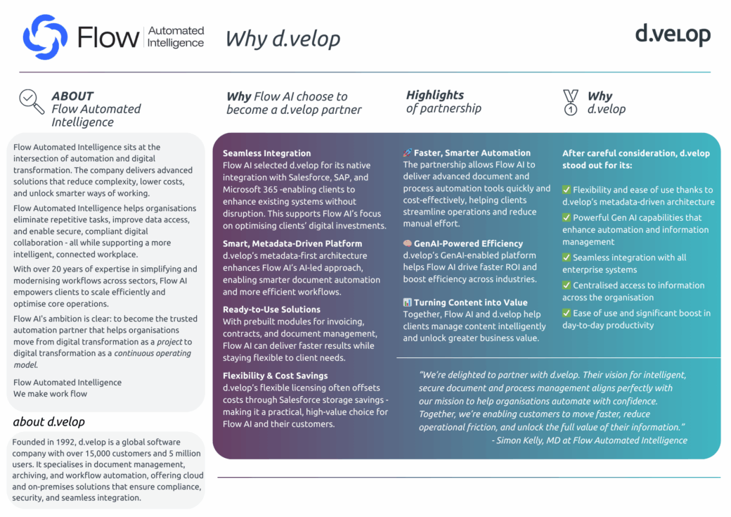 - GenAI-Powered Efficiency: d.velop’s GenAI-enabled platform helps Flow AI drive faster ROI and boost efficiency across industries.