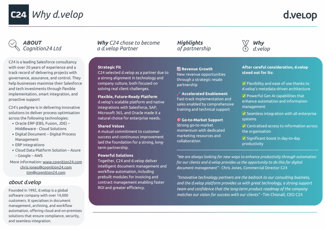 - Strategic Fit: C24 selected d.velop as a partner due to a strong alignment in technology and company culture, both focused on solving real client challenges.